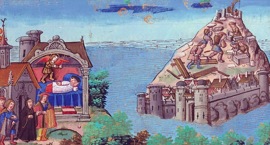 A gauche, Monsieur Saint Michel apparaît en songe à Aubert, évêque d’Avranches.